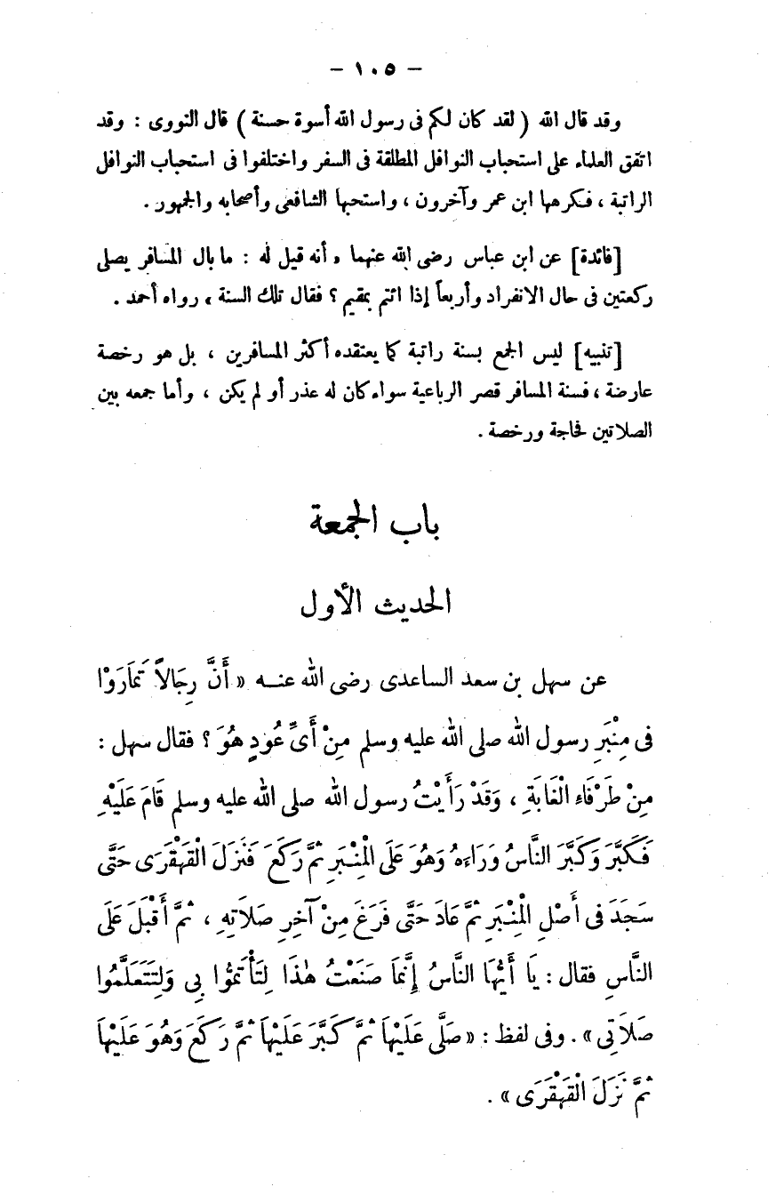 عن سهل بن سعد الساعدي - رضي الله عنه - أن رجالاً تمارَوْا في منبر رسول الله - صلى الله عليه وسلم - من أي عود هو؟ فقال سهل: من طرفاء الغابة، وقد رأيت رسول الله - صلى الله عليه وسلم - قام عليه فكبَّر وكبَّر الناس وراءه وهو على المنبر، ثم ركع فنزل القهقرى حتى سجد في أصل المنبر، ثم عاد حتى فرغ من آخر صلاته، ثم أقبل على الناس فقال: ((يا أيها الناس، إنما صنعت هذا لتأتمُّوا بي ولتتعلموا صلاتي)) ، وفي لفظ: "صلى عليها، ثم كبَّر عليها، ثم ركع وهو عليها ثم نزل القهقرى".