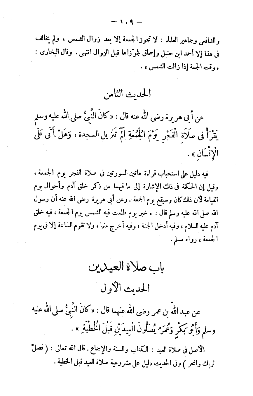 عن عبد الله بن عمر - رضي الله عنهما - قال: "كان النبي - صلى الله عليه وسلم - وأبو بكر وعمر يصلون العيدين قبل الخطبة".