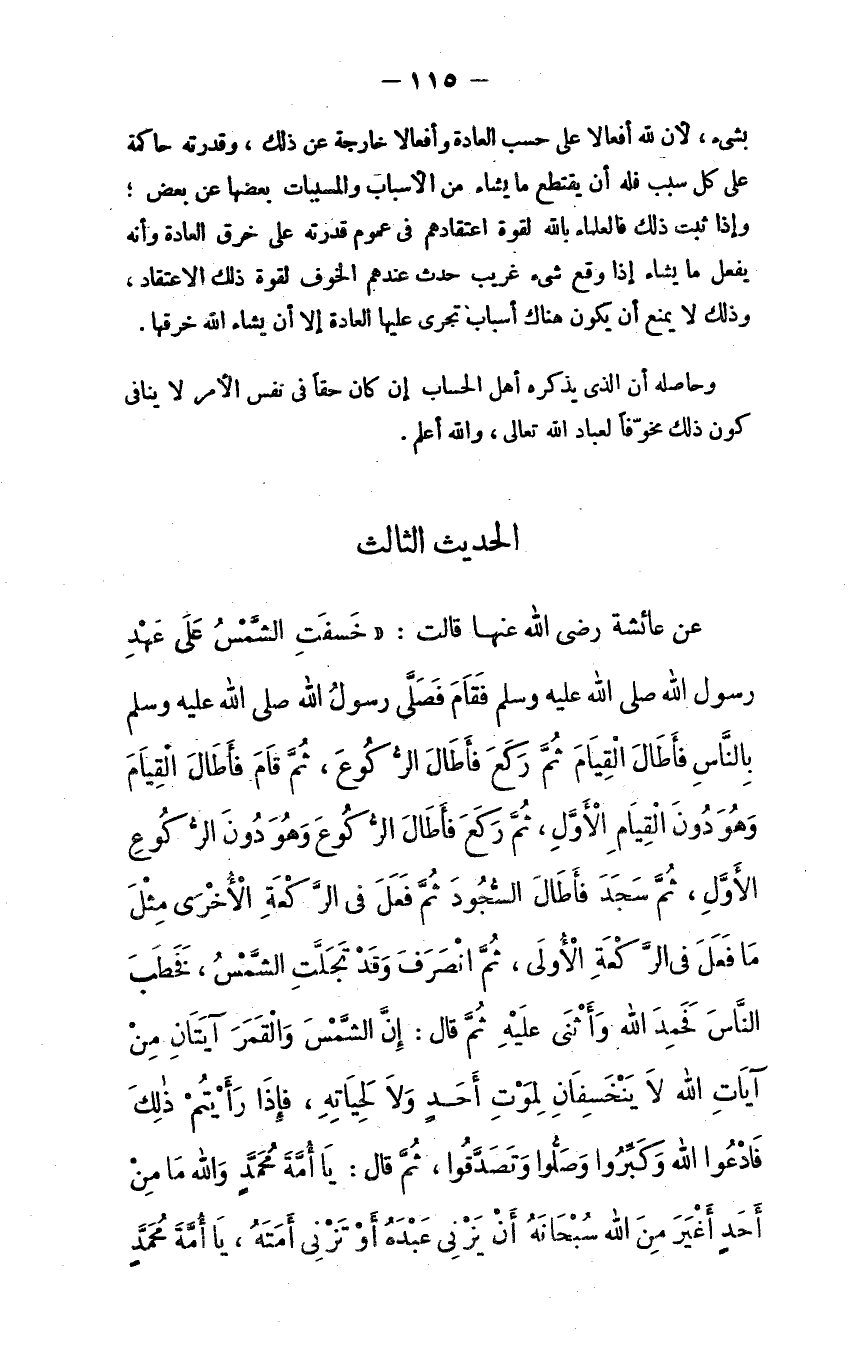عن عائشة - رضي الله عنها - قالت: "خُسِفت الشمس على عهد رسول الله - صلى الله عليه وسلم - فقام فصلَّى رسول الله - صلى الله عليه وسلم - بالناس فأطال القيام، ثم ركع فأطال الركوع، ثم قام فأطال القيام وهو دون القيام الأول، ثم ركع فأطال الركوع وهو دون الركوع الأول، ثم سجد فأطال السجود، ثم فعل في الركعة الأخرى مثلما فعَل في الركعة الأولى، ثم انصرف وقد تجلَّت الشمس، فخطَب الناس فحَمِد الله وأثنى عليه، ثم قال: ((إن الشمس والقمر آيتان من آيات الله لا ينخسفان لموت أحدٍ ولا لحياته، فإذا رأيتم ذلك فادعوا الله وكبِّروا وصلُّوا وتصدَّقوا)) ، ثم قال: ((يا