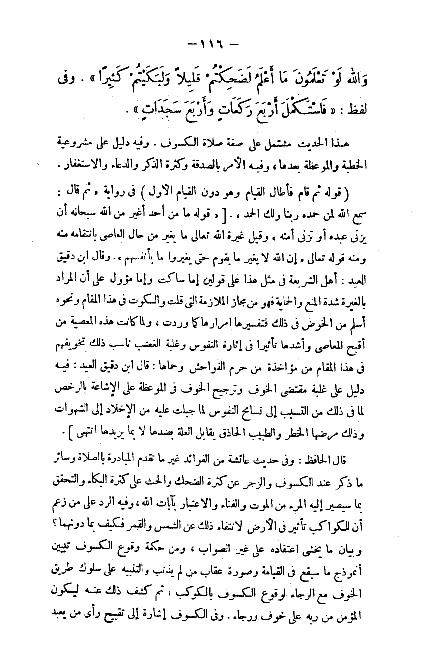 قال الحافظ: وفي حديث عائشة من الفوائد غير ما تقدَّم المبادرة بالصلاة وسائر ما ذكر عند الكسوف، والزجر عن كثرة الضحك والحث على كثرة البكاء، والتحقُّق بما سيصير إليه المرء من الموت والفناء والاعتبار بآيات الله، وفيه الرد على مَن زعم أن للكواكب تأثيرًا في الأرض؛ لانتفاء ذلك عن الشمس