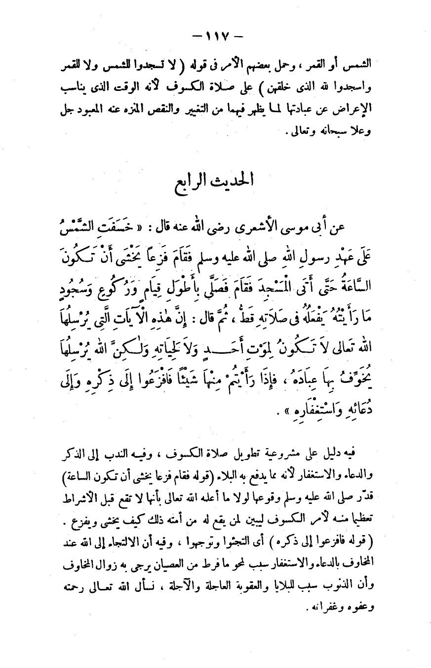 عن أبي موسى الأشعري - رضي الله عنه - قال: "خسفت الشمس على عهد رسول الله - صلى الله عليه وسلم - فقام فزعًا يخشى أن تكون الساعة حتى أتى المسجد فقام فصلى بأطول قيام وركوع وسجود ما رأيته يفعله في صلاته قطُّ، ثم قال: إن هذه الآيات التي يرسلها الله - تعالى - لا تكون لموت أحد ولا لحياته، ولكن الله يرسلها يخوِّف بها عباده، فإذا رأيتم منها شيئًا فافزعوا إلى ذكره وإلى دعائه واستغفاره)) .
