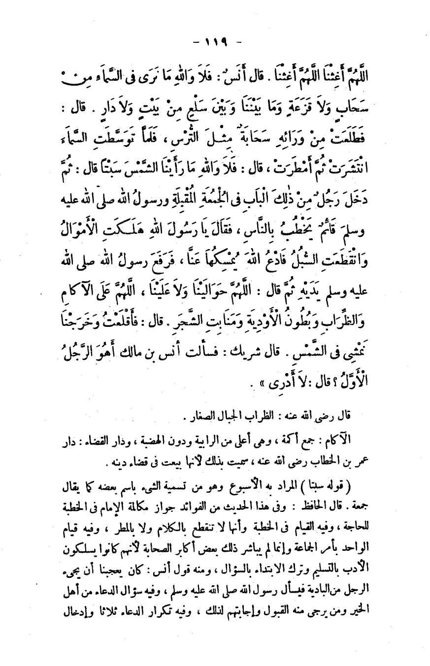 بالناس، فقال: يا رسول الله، هلك الأموال، وانقطعت السبل، فادعُ الله يمسكها عنَّا، فرفع رسول الله - صلى الله عليه وسلم - يديه ثم قال: ((اللهم حوالينا ولا علينا، اللهم على الآكَام والظِّرَاب وبطون الأودية ومنابت الشجر)) ، قال: فأقلعت وخرجنا نمشي في الشمس، قال شريك: فسألت أنس بن مالك أهو الرجل الأول؟ قال: لا أدري.