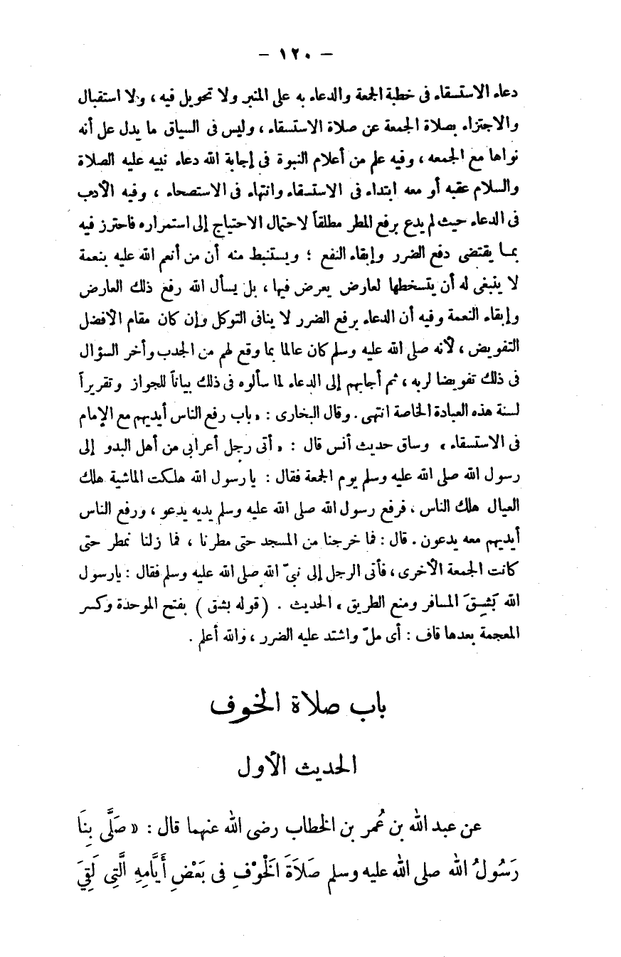 عن عبد الله بن عمر بن الخطاب - رضي الله عنهما - قال: "صلى بنا رسول الله - صلى الله عليه وسلم - صلاة الخوف في بعض أيامه التي لقي