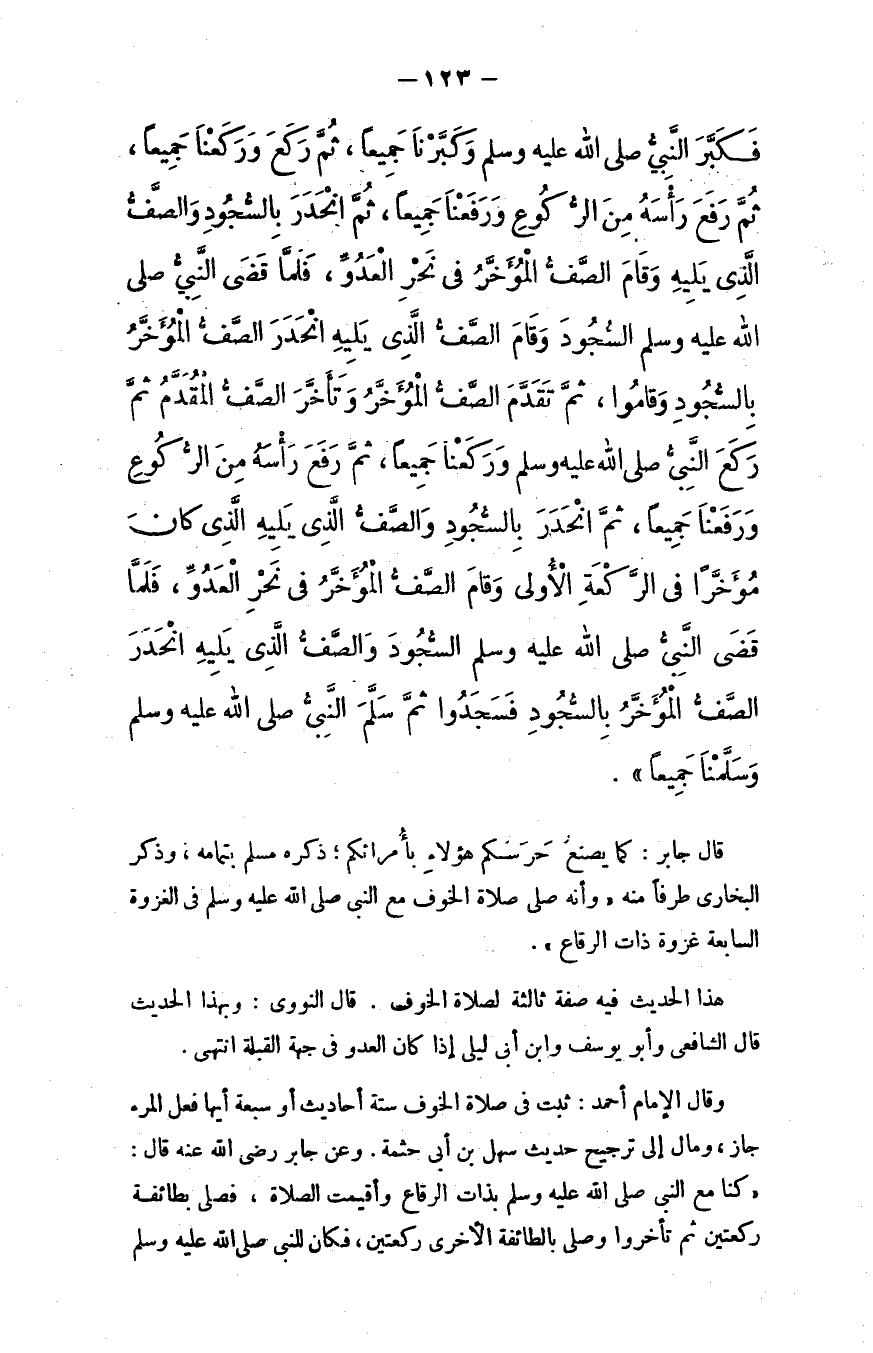 فكبر النبي - صلى الله عليه وسلم - وكبَّرنا جميعًا، ثم ركع وركعنا جميعًا، ثم رفَع رأسه من الركوع ورفعنا جميعًا، ثم انحدر بالسجود والصف الذي يليه وقام الصف المؤخَّر في نحر العدو، فلمَّا قضى النبي - صلى الله عليه وسلم - السجود وقام الصف الذي يليه، انحدر الصف المؤخر بالسجود وقاموا، ثم تقدَّم الصف المؤخَّر وتأخَّر الصف المقدَّم، ثم ركع النبي - صلى الله عليه وسلم - وركعنا جميعًا، ثم رفع رأسه من الركوع ورفعنا جميعًا، ثم انحدر بالسجود والصف الذي يليه الذي كان مؤخرًا في الركعة الأولى، وقام الصف المؤخَّر في نحر العدو، فلمَّا قضى النبي - صلى الله عليه وسلم - السجود والصف الذي يليه انحدر الصف المؤخر بالسجود فسجدوا ثم سلم النبي - صلى الله عليه وسلم - وسلمنا جميعًا.