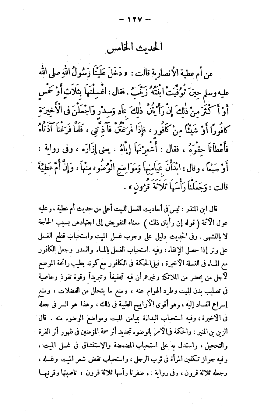 عن أم عطية الأنصارية قالت: دخل علينا رسول الله - صلى الله عليه وسلم - حين توفيت ابنته زينب، فقال: ((اغسلنها بثلاث أو خمس أو أكثر من ذلك إن رأيتن ذلك بماء