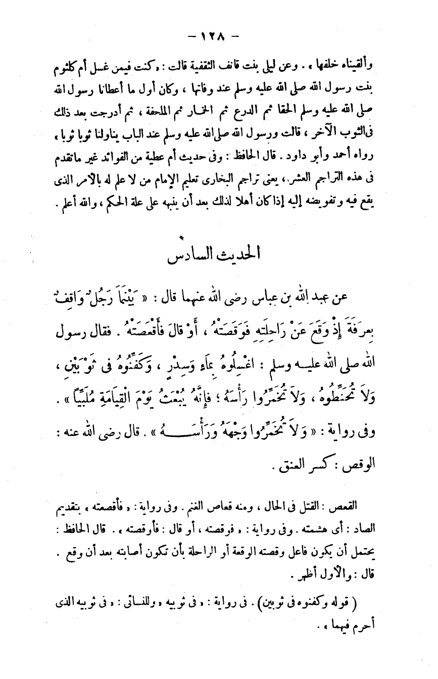 عن عبد الله بن عباس - رضي الله عنهما - قال: "بينما رجل واقف بعرفة إذ وقع عن راحلته فوقصته، أو قال فأقعصته، فقال رسول الله - صلى الله عليه وسلم -: ((اغلسلوه بماء وسدر، وكفِّنوه في ثوبين، ولا تحنِّطوه، ولا تخمِّروا رأسه؛ فإنه يبعث يوم القيامة ملبيًا)) .