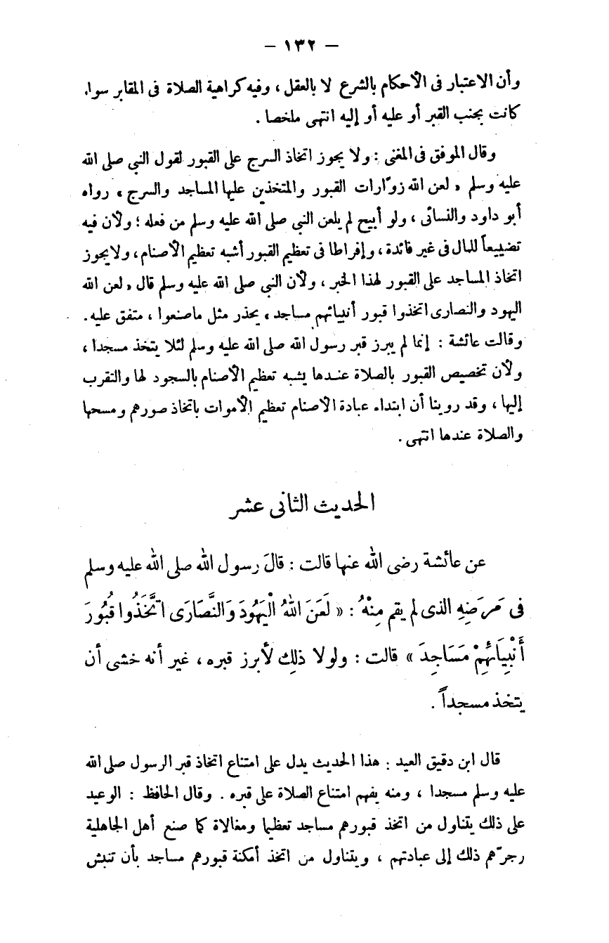 وقال الحافظ: الوعيد على ذلك يتناول مَن اتخذ قبورهم مساجد تعظيمًا ومغالاة كما صنع أهل الجاهلية وجرَّهم ذلك إلى عبادتهم، ويتناول مًن اتَّخذ أمكنة قبورهم مساجد بأن تنبش