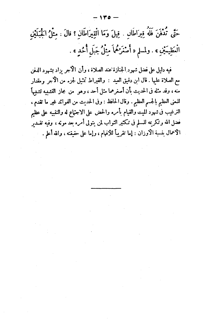 وقال الحافظ: وفي الحديث من الفوائد غير ما تقدَّم، الترغيب في شهود الميت والقيام بأمره، والحض على الاجتماع له والتنبيه على عظيم فضل الله وتكريمه للمسلم في تكثير الثواب لِمَن يتولى أمره بعد موته، وفيه تقدير الأعمال بنسبة الأوزان: إما تقريبًا للأفهام، وإما على حقيقته، والله أعلم.