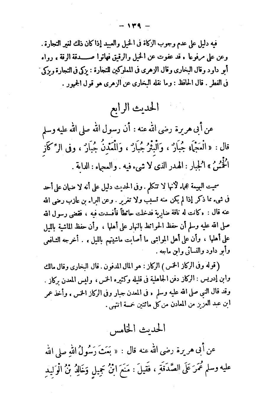 عن أبي هريرة - رضي الله عنه -: أن رسول الله - صلى الله عليه وسلم - قال: ((العَجْمَاء جُبَار، والبئر جُبَار، والمَعْدِن جُبَار، وفي الرِّكَاز الخمس)) ، الجُبَار: الهَدَر الذي لا شيء فيه، و ((العجماء)) : الدابة، سميت البهيمة عجماء؛ لأنها لا تتكلم.