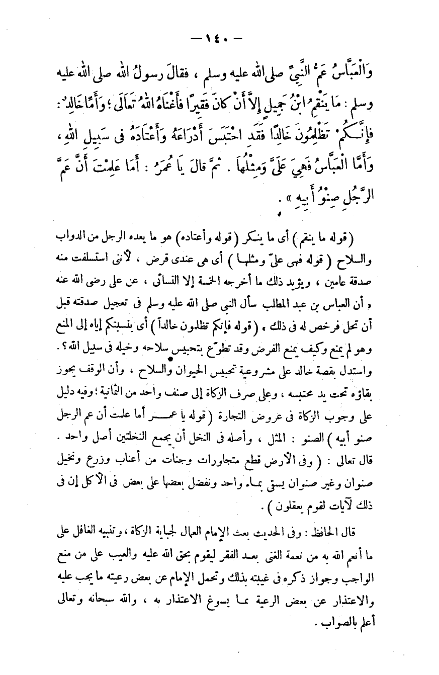 والعباس عم النبي - صلى الله عليه وسلم - فقال رسول الله - صلى الله عليه وسلم -: ((ما ينقم ابن جميل إلاَّ أن كان فقيرًا فأغناه الله - تعالى - وأمَّا خالد فإنكم تظلمون خالدًا؛ فقد احتبس أدراعه وأعتاده في سبيل الله، وأمَّا العباس فهي عليَّ ومثلها)) ، ثم قال: ((يا عمر، أمَا علمت أن عم الرجل صِنْوُ أبيه)) .