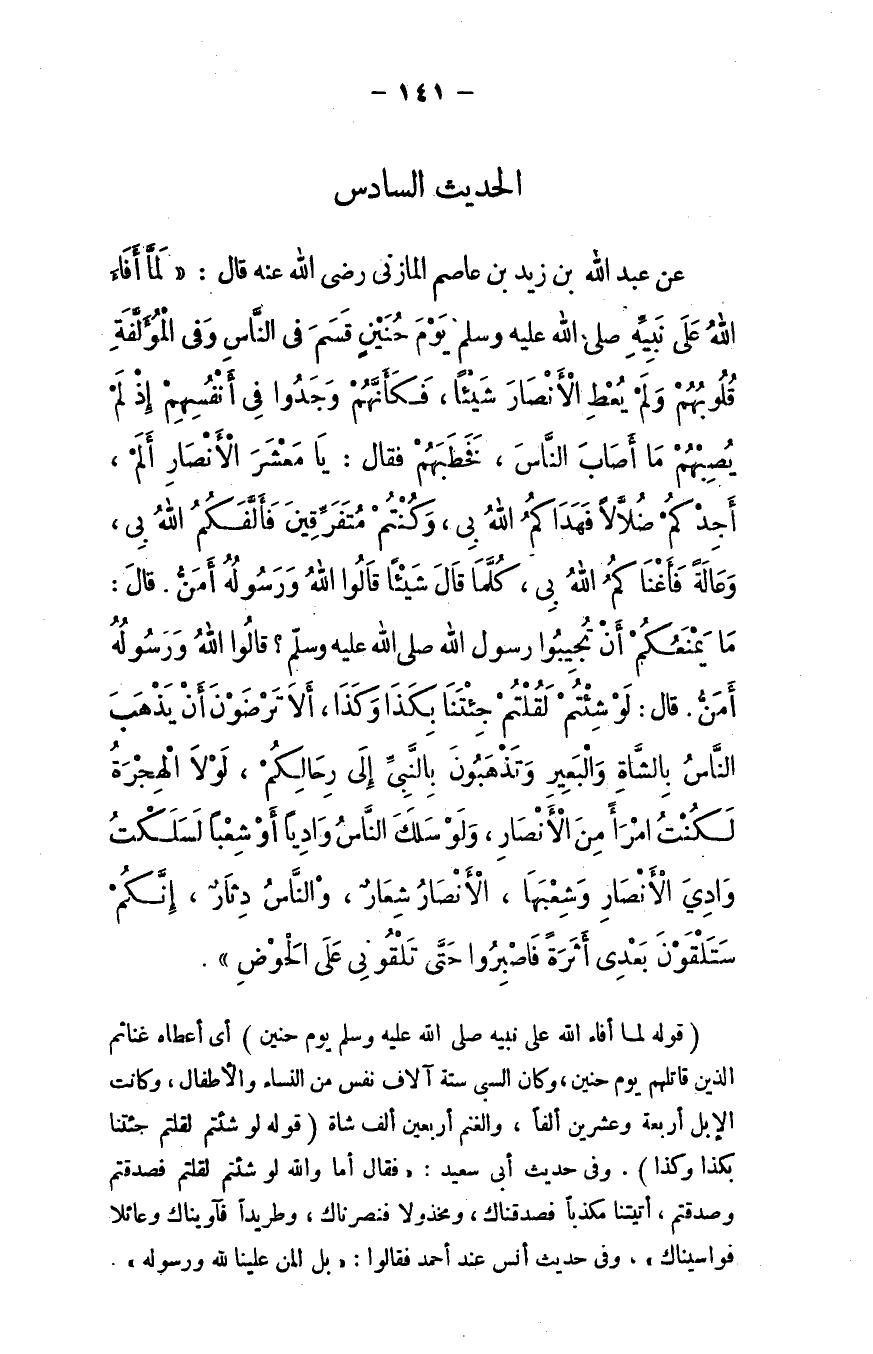 عن عبد الله بن زيد بن عاصم المازني - رضي الله عنه - قال: "لمَّا أفاء الله على نبيه - صلى الله عليه وسلم - يوم حنين قسم في الناس وفي المؤلَّفة قلوبهم ولم يعطِ الأنصار شيئًا، فكأنما وجدوا في أنفسهم؛ إذ لم يصبهم ما أصاب الناس، فخطبهم فقال: ((يا معشر الأنصار، ألم أجدكم ضُلاَّلاً فهداكم الله بي، وكنتم متفرِّقين فألَّفكم الله بي، وعالة فأغناكم الله بي؟)) ، كلَّما قال شيئًا قالوا: الله ورسوله أمنُّ، قال: ((ما يمنعكم أن تجيبوا رسول الله - صلَّى الله عليه وسلَّم؟)) ، قالوا: الله ورسوله أمنُّ، قال: ((لو شئتم لقلتم: جئتَنا بكذا وكذا، ألا ترضَون أن يذهب الناس بالشاة والبعير وتذهبون بالنبي إلى رحالكم، لولا الهجرة لكنت امرأً من الأنصار، ولو سلك الناس واديًا أو شعبًا لسلكت وادي الأنصار وشعبها، الأنصار شعار، والناس دثار، إنكم ستلقَون بعدي أثَرَة فاصبروا حتى تلقوني على الحوض)) .