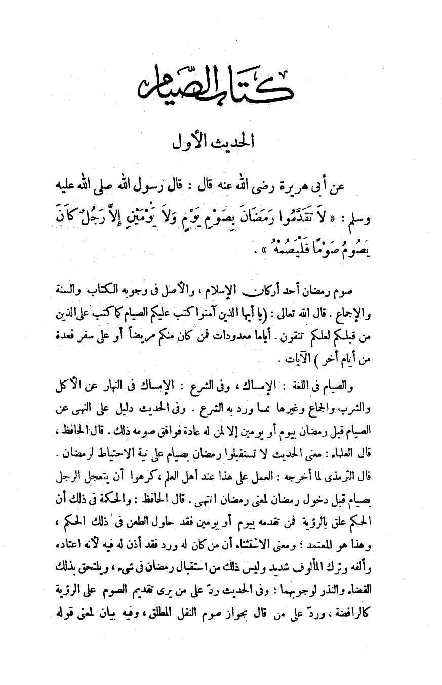 عن أبي هريرة - رضي الله عنه - قال: قال رسول الله - صلى الله عليه وسلم -: ((لا تقدموا رمضان بصوم يوم ولا يومين إلا رجل كان يصوم صومًا فليصمه)) .