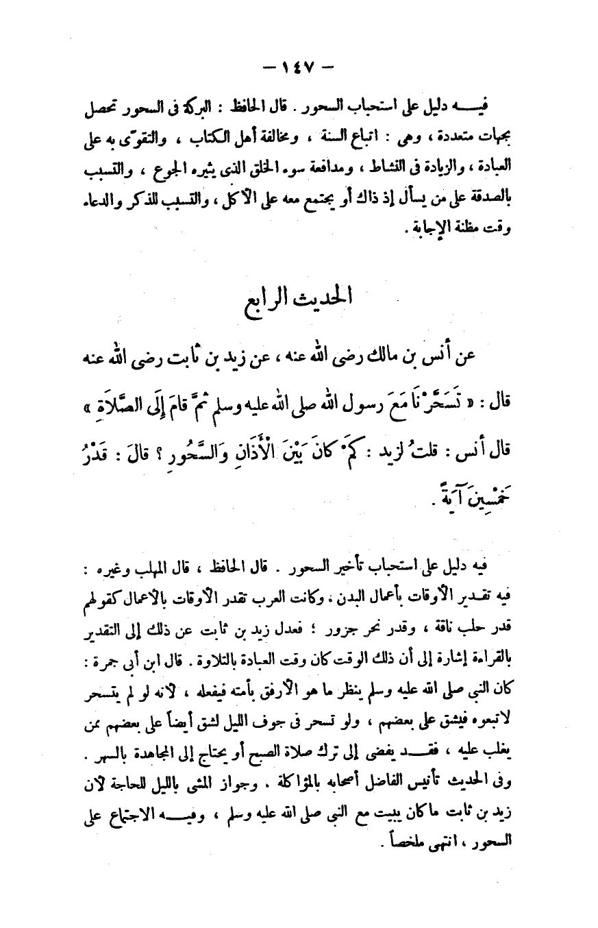 عن أنس بن مالك - رضي الله عنه - عن زيد بن ثابت - رضي الله عنه - قال: "تسحَّرنا مع رسول الله - صلى الله عليه وسلم - ثم قام إلى الصلاة، قال أنس: قلت لزيد: كم كان بين الأذان والسحور؟ قال: قدر خمسين آية".