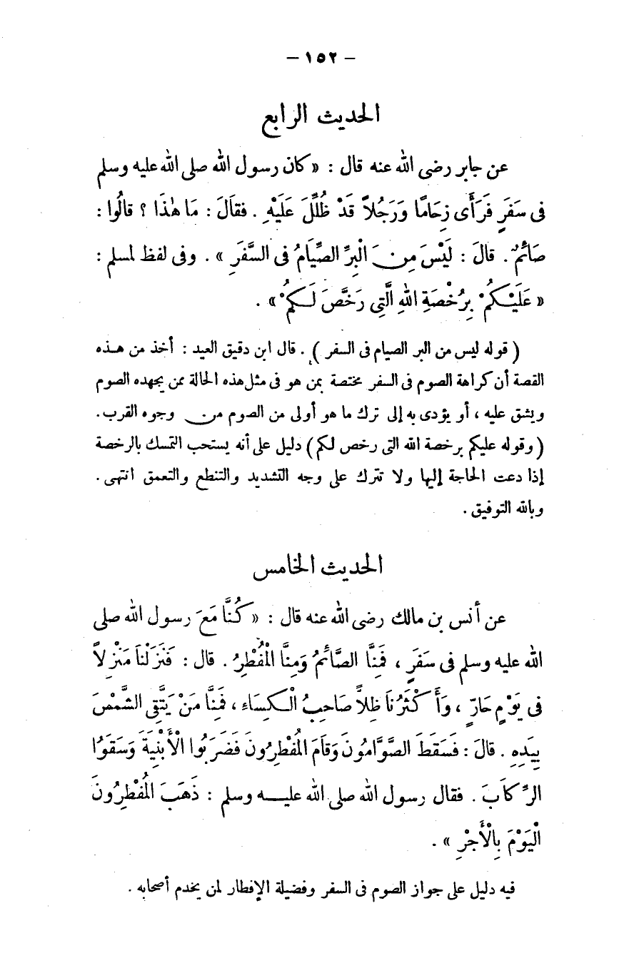 عن أنس بن مالك - رضي الله عنه - قال: "كنا مع رسول الله - صلى الله عليه وسلم - في سفر، فمنَّا الصائم ومنَّا المفطر، قال: فنزلنا منزلاً في يوم حار، وأكثرنا ظلاًّ صاحب الكساء، فمنَّا مَن يتَّقي الشمس بيده، قال: فسقط الصوَّامون وقام المفطِرون فضربوا الأبنية وسقوا الركاب، فقال رسول الله - صلى الله عليه وسلم -: ((ذهب المفطرون اليوم بالأجر)) .