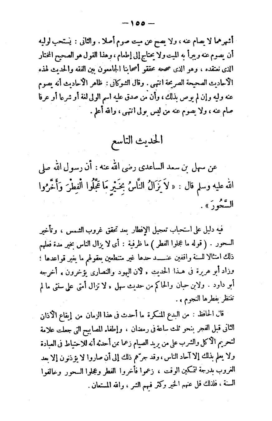 عن سهل بن سعد الساعدي - رضي الله عنه -: أن رسول الله - صلى الله عليه وسلم - قال: ((لا يزال الناس بخيرٍ ما عجَّلوا الفطر وأخَّروا السحور)) .