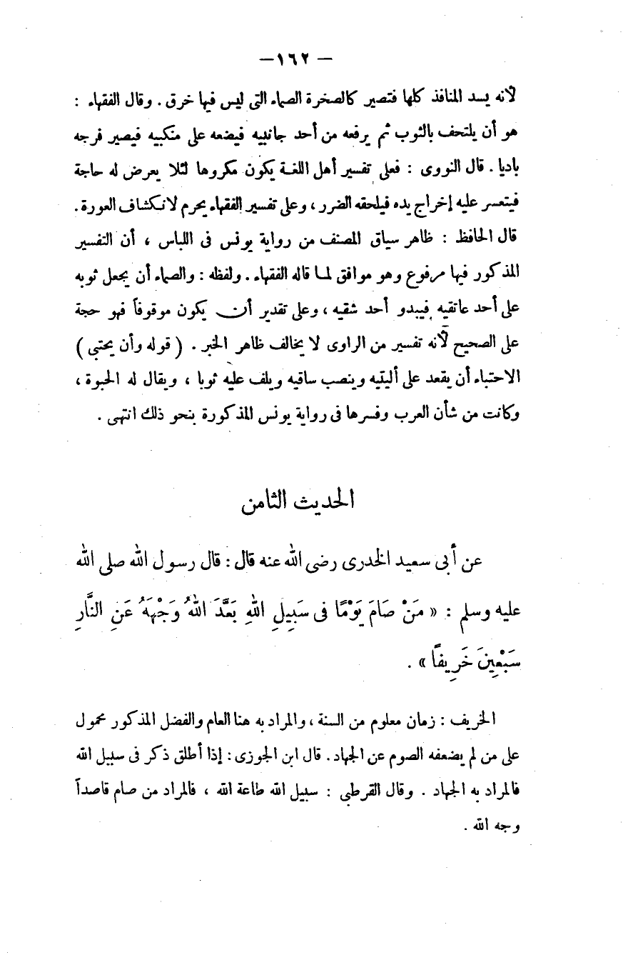 عن أبي سعيد الخدري - رضي الله عنه - قال: قال رسول الله - صلى الله عليه وسلم -: ((مَن صام يومًا في سبيل الله بَعَّدَ الله وجهه عن النار سبعين خريفًا)) .