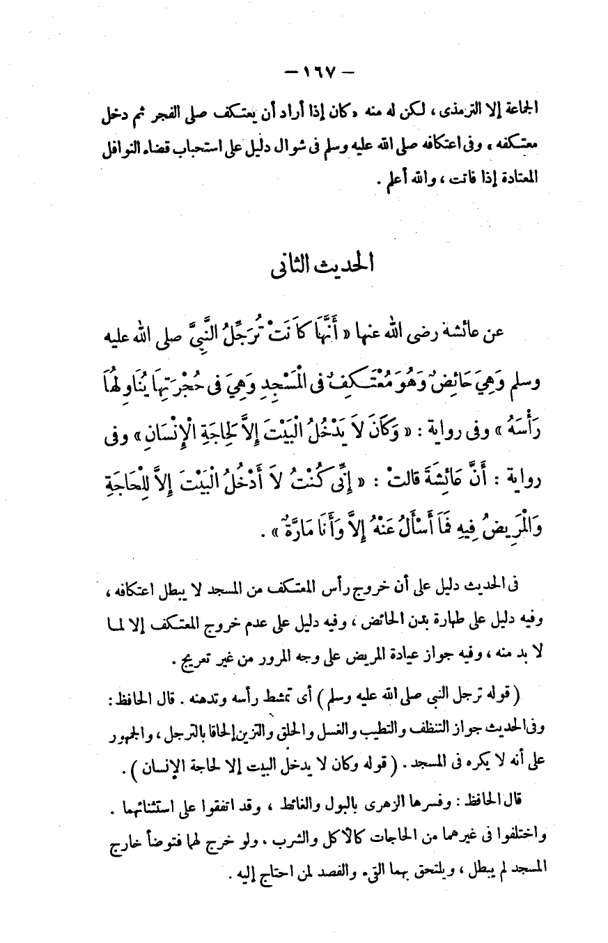 عن عائشة - رضي الله عنها - أنها كانت تُرَجِّل النبي - صلى الله عليه وسلم - وهي حائض وهو معتكِف في المسجد وهي في حجرتها يناولها رأسه، وفي رواية: وكان لا يدخل البيت إلا لحاجه الإنسان، وفي رواية: أن عائشة قالت: "إني كنت لا أدخل البيت إلا للحاجة والمريض فيه فما أسأل عنه إلا وأنا مارَّه".