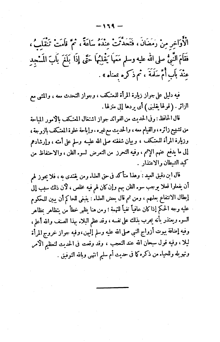 قال الحافظ: وفي الحديث من الفوائد جواز اشتغال المعتكِف بالأمور المباحة؛ من تشييع زائره، والقيام معه، والحديث مع غيره، وإباحة خلوة المعتكف بالزوجة، وزيارة المرأة للمعتكف، وبيان شفَقَتِه - صلى الله عليه وسلم - على أمته، وإرشادهم إلى ما يدفع عنهم الإثم، وفيه التحرُّز من التعرُّض لسوء الظن، والاحتفاظ من كيد الشيطان والاعتذار.