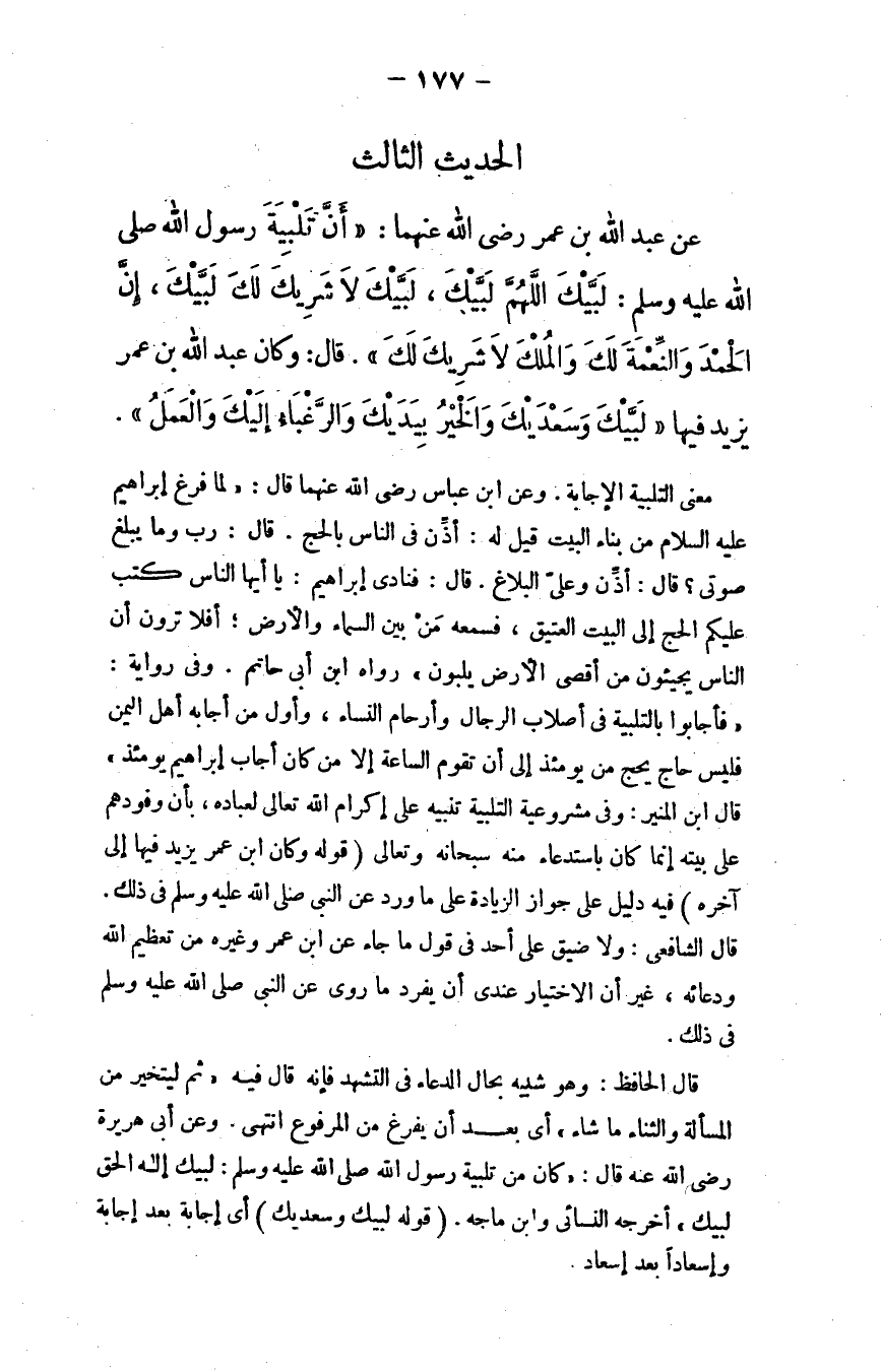 عن عبد الله بن عمر - رضي الله عنهما -: "أن تلبية رسول الله - صلى الله عليه وسلم -: ((لبيك اللهم لبيك، لبيك لا شريك لك لبيك، إن الحمد والنعمة لك والملك لا شريك لك)) ، قال: وكان عبد الله بن عمر يزيد فيها ((لبيك وسعديك والخير بيديك، والرغباء إليك والعمل)) ؛ معنى (التلبية) : الإجابة.