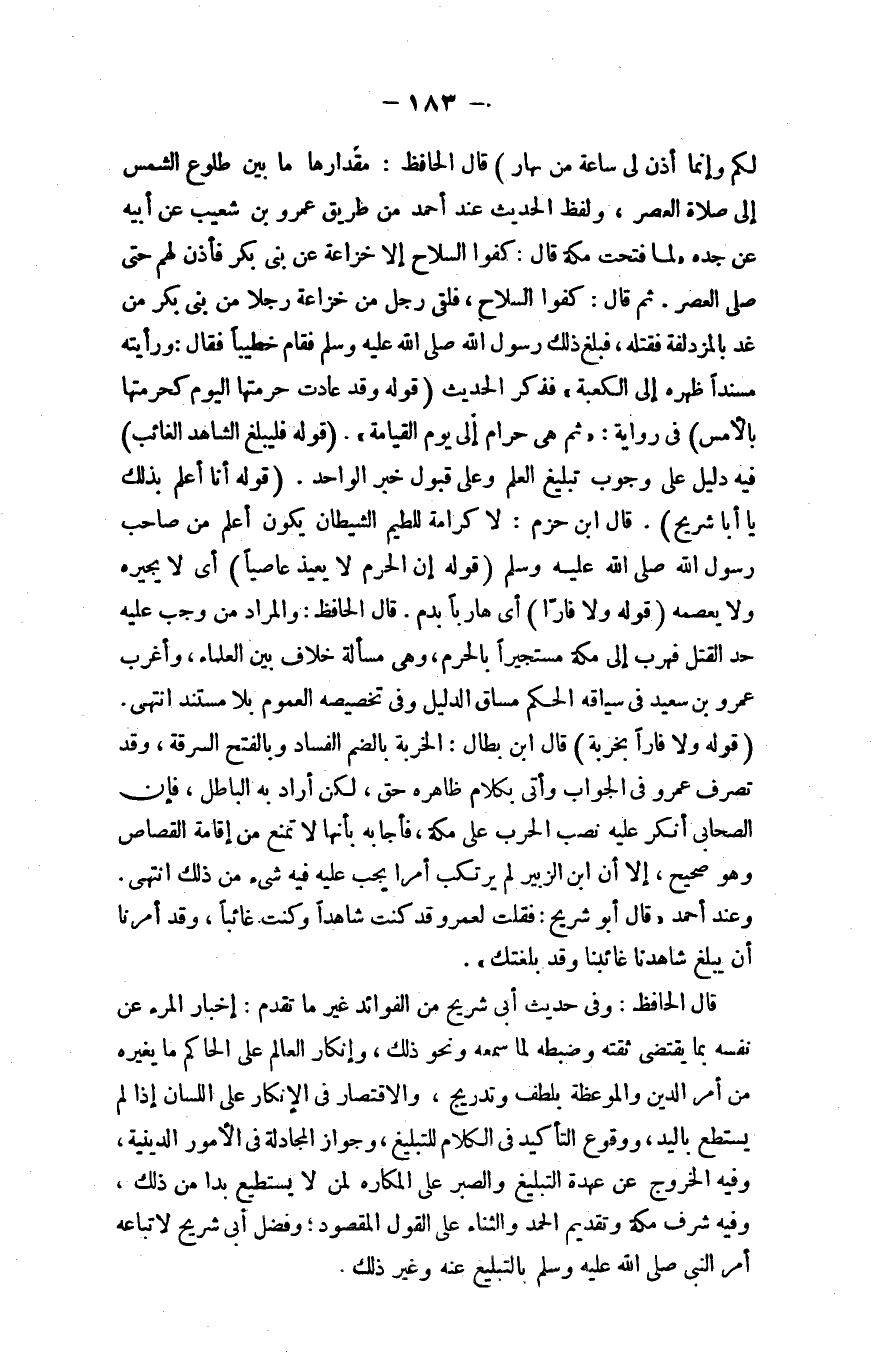 لكم وإنما أذن لي ساعة من نهار)) قال الحافظ: مقدارها ما بين طلوع الشمس إلى صلاة العصر، ولفظ الحديث عند أحمد من طريق عمرو بن شعيب، عن أبيه، عن جده: لما فتحت مكة قال: "كفوا السلاح إلا خزاعة عن بني بكر فأَذِن لهم حتى صلى العصر، ثم قال: كفوا السلاح، فلقي رجل من خزاعة رجلاً من بني بكر من غَدٍ بالمزدلفة فقتله، فبلغ ذلك رسول الله - صلى الله عليه وسلم - فقام خطيبًا فقال - ورأيته مسندًا ظهره إلى الكعبة ... فذكر الحديث.