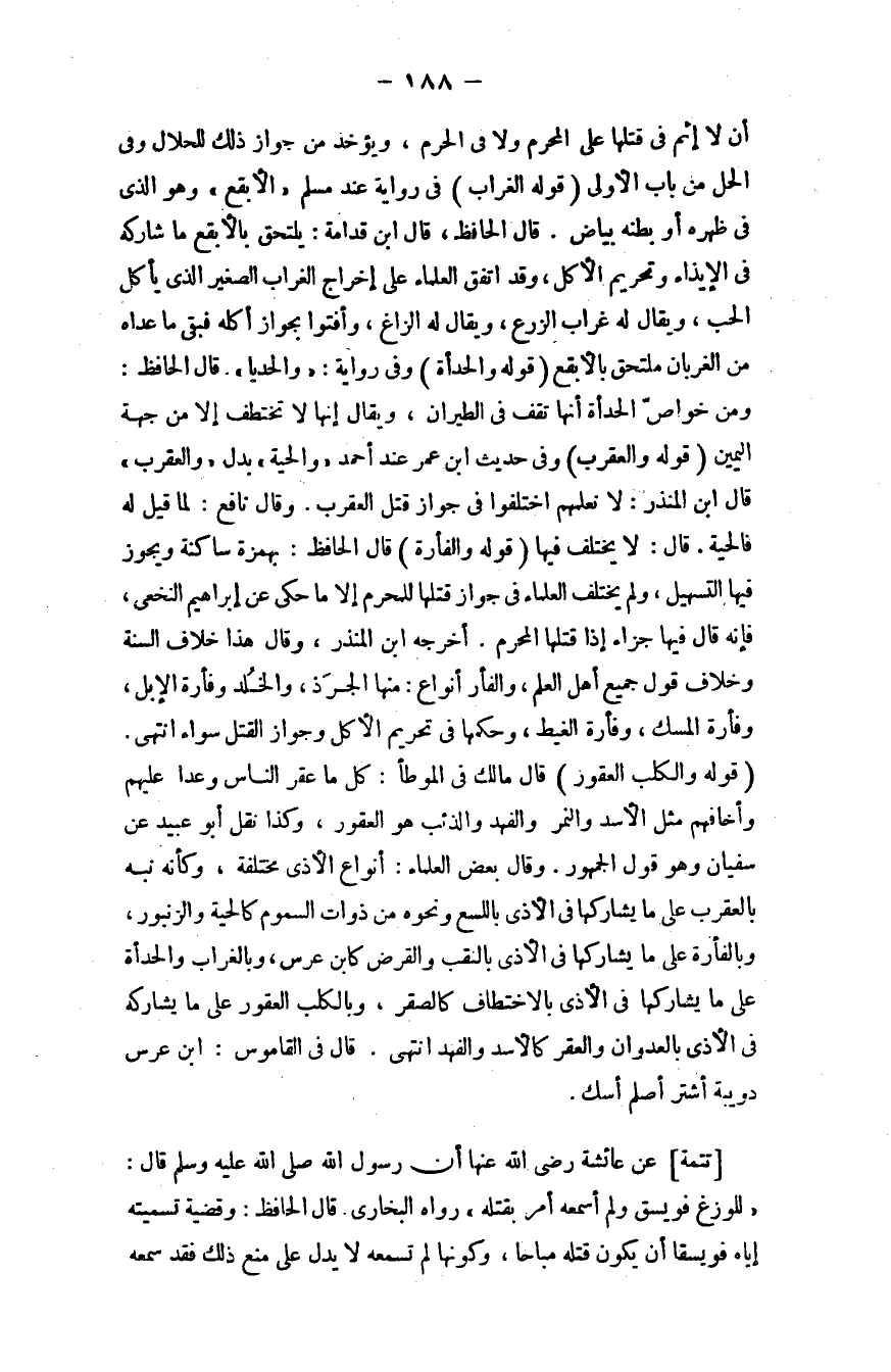 وقال بعض العلماء: أنواع الأذى مختلفة، وكأنَّه نبَّه بالعقرب على ما يُشارِكها في الأذى باللسع ونحوه من ذوات السموم؛ كالحية، والزنبور، وبالفأرة على ما يشاركها في الأذى بالنقب والقرض كابن عرس، وبالغراب والحدأة على ما يشاركها في الأذى بالاختطاف كالصقر، وبالكلب العقور على ما يشاركه في الأذى بالعدوان والعقر كالأسد والفهد، انتهى.
