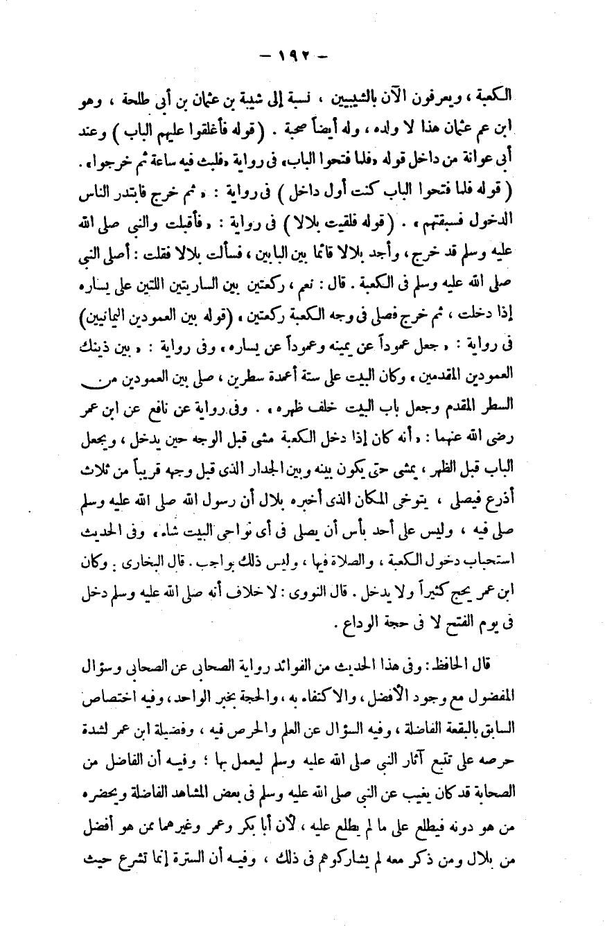 وفي روايةٍ عن نافع، عن ابن عمر - رضي الله عنهما -: "أنه كان إذا دخل الكعبة مشى قبل الوجه حين يدخل، ويجعل الباب قبل الظهر، يمشي حتى يكون بينه وبين الجدار الذي قبل وجهه قريبًا من ثلاث أذرع فيصلي، يتوخَّى المكان الذي أخبره بلال أن رسول الله - صلى الله عليه وسلم - صلى فيه، وليس على أحد بأسٌ أن يصلي في أيِّ نواحي البيت شاء"، وفي الحديث استحباب دخول الكعبة، والصلاة فيها، وليس ذلك بواجب.