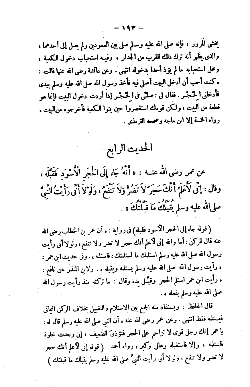عن عمر - رضي الله عنه -: "أنه جاء إلى الحجر الأسود فقبَّله، وقال: إني لأعلم أنك حجر لا تضرُّ ولا تنفع، ولولا أني رأيت النبي - صلى الله عليه وسلم - يقبِّلك ما قبَّلتك".