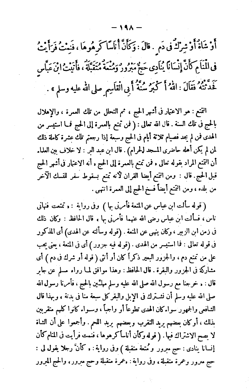 أو شاة أو شرك في دم، قال: وكأن أناسًا كرهوها، فنمت فرأيت في المنام كأن إنسانًا ينادي: حج مبرور ومتعة متقبلة، فأتيت ابن عباس فحدَّثته فقال: الله أكبر، سنَّة أبي القاسم - صلَّى الله عليه وسلَّم".