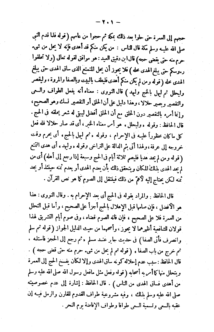 قوله: "فلمَّا قدم النبي - صلى الله عليه وسلم - قال للناس: ((مَن يكن منكم أهدى فإنه لا يحلُّ من شيء حرم منه حتى يقضى حجه)) قال ابن دقيق العيد: هو موافق لقوله - تعالى -: {وَلاَ تَحْلِقُوا رُؤُوسَكُمْ حَتَّى يَبْلُغَ الْهَدْيُ مَحِلَّهُ} [البقرة: 196] ، فلا يجوز أن يحلَّ المتمتُّع الذي ساق الهدي حتى يبلغ الهدي محلَّه.