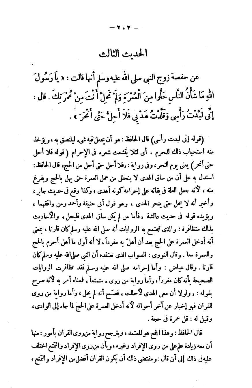 وقال النووي: الصواب الذي نعتقده أن النبي - صلى الله عليه وسلم - كان قارنًا، وقال عياض: وأمَّا إحرامه - صلى الله عليه وسلم - فقد تضافرت الروايات الصحيحة بأنه كان مفردًا، وأمَّا رواية مَن روى: ((متمتعًا)) فمعناه أمر به؛ لأنه صرَّح بقوله: ((ولولا أن معي الهدي لأحللت)) فصحَّ أنه لم يحلَّ، وأمَّا رواية مَن روى القِرَان فهو إخبار عن آخر أحواله؛ لأنه أدخل العمرة على الحج لما جاء إلى الوادي، وقيل له: قل عمرة في حجة.