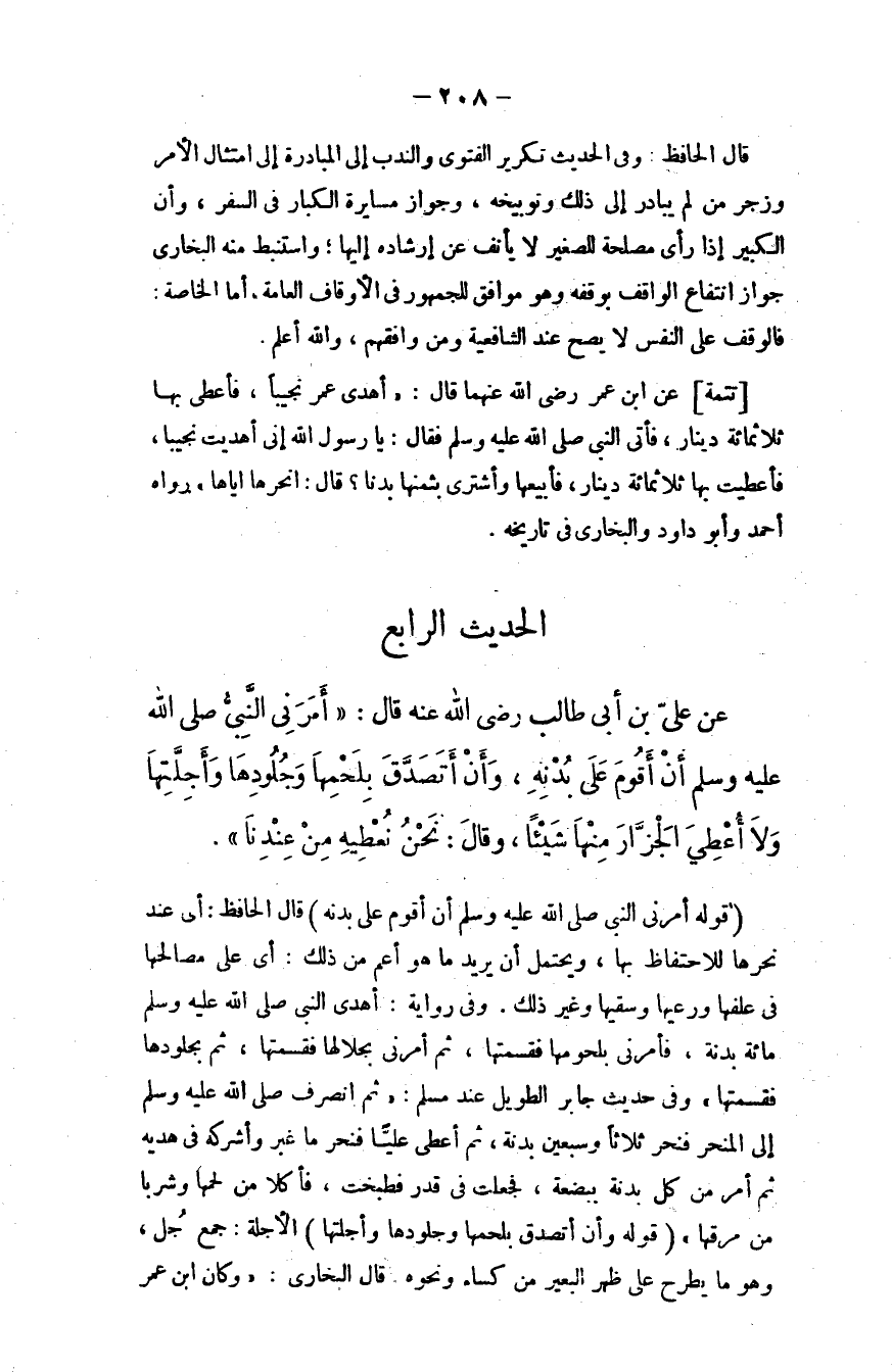 عن علي بن أبي طالب - رضي الله عنه - قال: أمرني النبي - صلى الله عليه وسلم - أن أقوم على بدنِه، وأن أتصدَّق بلحمها وجلودها وأجلتها، ولا أعطي الجزار منها شيئًا، وقال: ((نحن نعطيه من عندنا)) .