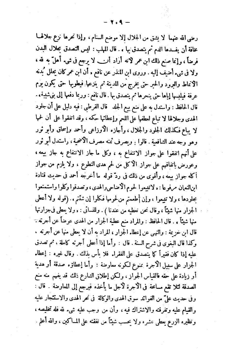 رضي الله عنهما - لا يشق من الجلال إلا موضع السنام، وإذا نحرها نزع جلالها مخافة أن يفسدها الدم ثم يتصدَّق بها".