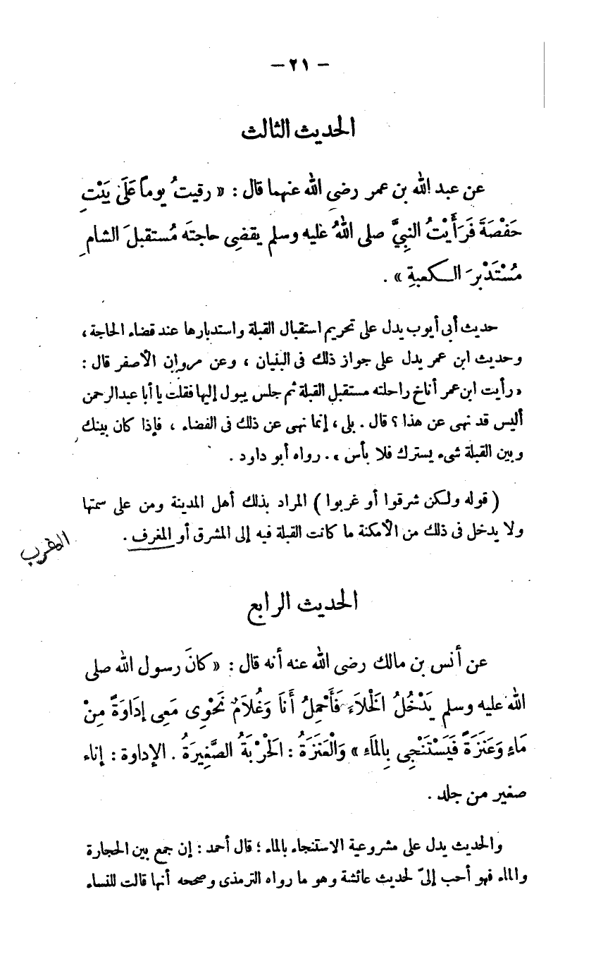 عن عبد الله بن عمر - رضي الله عنهما - قال: "رقيت يومًا على بيت حفصة فرأيت النبي - صلى الله عليه وسلم - يقضي حاجته مستقبل الشام مستدبر الكعبة".