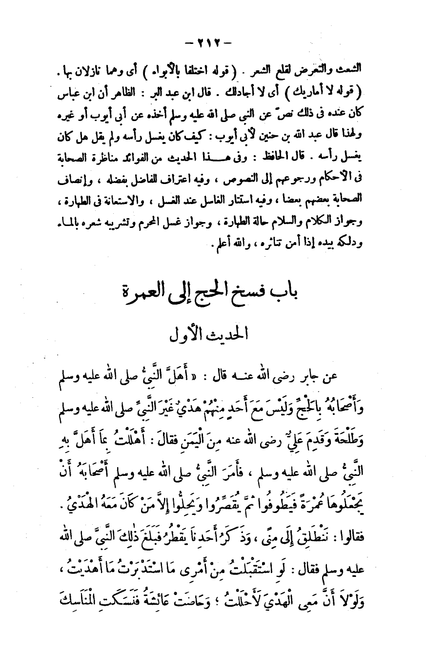 عن جابر - رضي الله عنه - قال: "أهلَّ النبي - صلى الله عليه وسلم - وأصحابه بالحج وليس مع أحدٍ منهم هدي غير النبي - صلى الله عليه وسلم - وطلحة، وقَدِم علي - رضي الله عنه - من اليمن فقال: أهللت بما أهل به النبي - صلى الله عليه وسلم - فأمر النبي - صلى الله عليه وسلم - أصحابه أن يجعلوها عمرةً فيطوفوا، ثم يقصروا ويحلوا، إلاَّ مَن كان معه الهدي، فقالوا: ننطلق إلى منًى، وذكر أحدنا يقطر فبلغ ذلك النبي - صلى الله عليه وسلم - فقال: ((لو استقبلت من أمري ما استدبرت ما أهديت، ولولا أن معي الهدي لأحللت)) ، وحاضت عائشة فنسكت المناسك