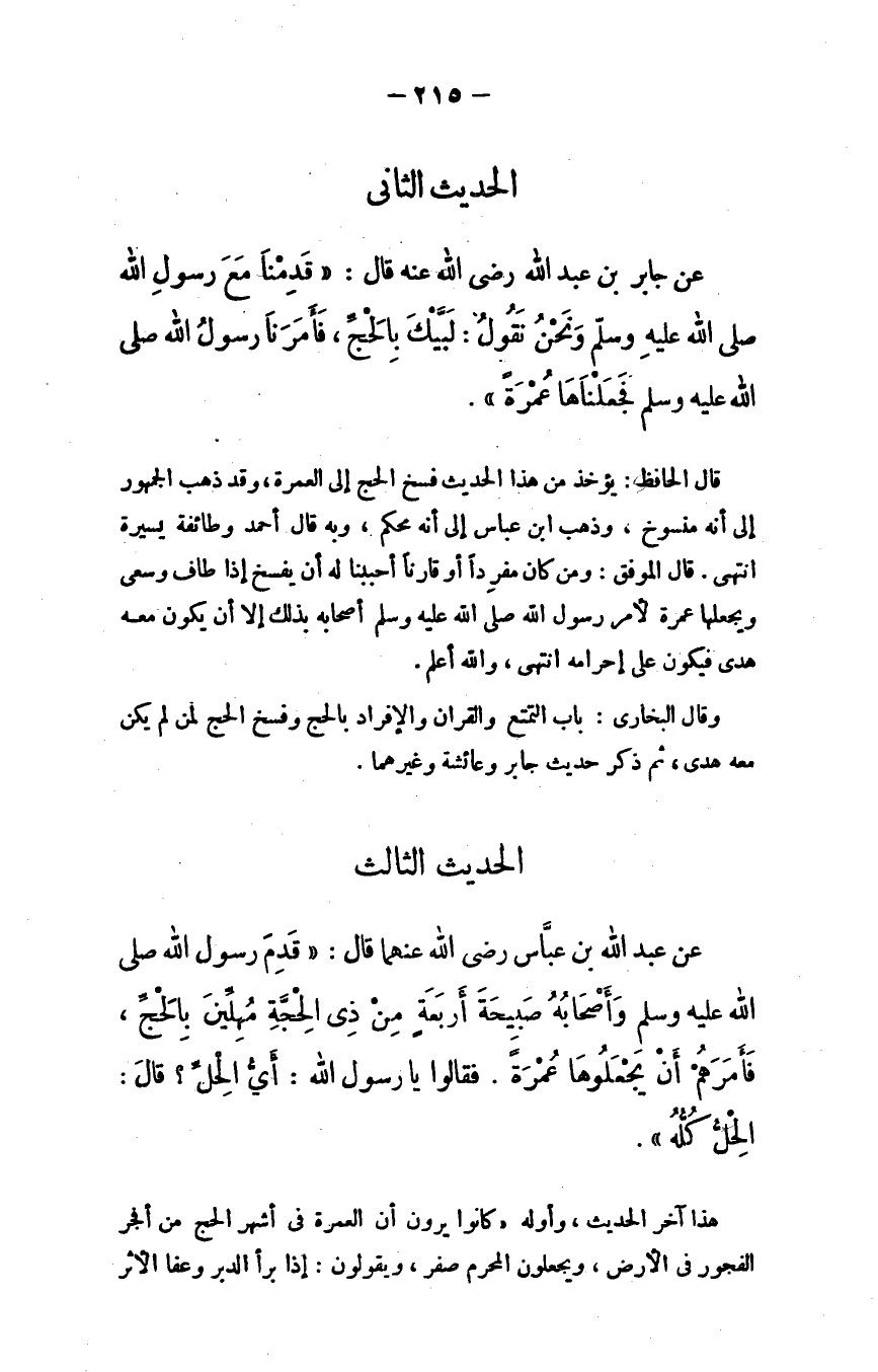 عن جابر بن عبد الله - رضي الله عنه - قال: "قدمنا مع رسول الله - صلى الله عليه وسلم - ونحن نقول: لبيك بالحج، فأمرنا رسول الله - صلى الله عليه وسلم - فجعلناها عمرة".