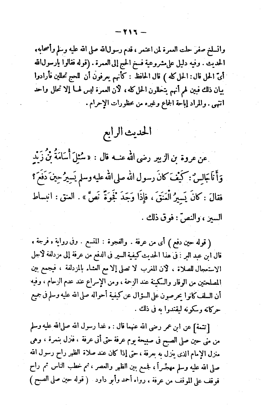 عن عروة بن الزبير - رضي الله عنه - قال: "سُئِل أسامة بن زيد وأنا جالس: كيف كان رسول الله - صلى الله عليه وسلم - يسير حين دفع؟ فقال: كان يسير العنق، فإذا وجد فجوة نص"، العنق: انبساط السير، والنص: فوق ذلك.