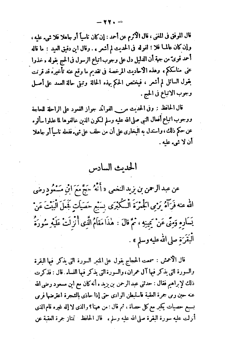 قال الأعمش: سمعت الحجاج يقول على المنبر: السورة التي يذكر فيها البقرة والسورة التي يذكر فيها آل عمران، والسورة التي يذكر فيها النساء، قال: فذكرت ذلك لإبراهيم فقال: حدثني عبد الرحمن بن يزيد أنه كان مع ابن مسعود - رضي الله عنه - حين رمى جمرة العقبة فاستبطن الوادي حتى إذا حاذَى بالشجرة اعترَضَها فرمى بسبع حصيات يكبِّر مع كل حصاة، ثم قال: من ها هنا، والذي لا إله غيره قام الذي أنزلت عليه سورة البقرة - صلَّى الله عليه وسلَّم.