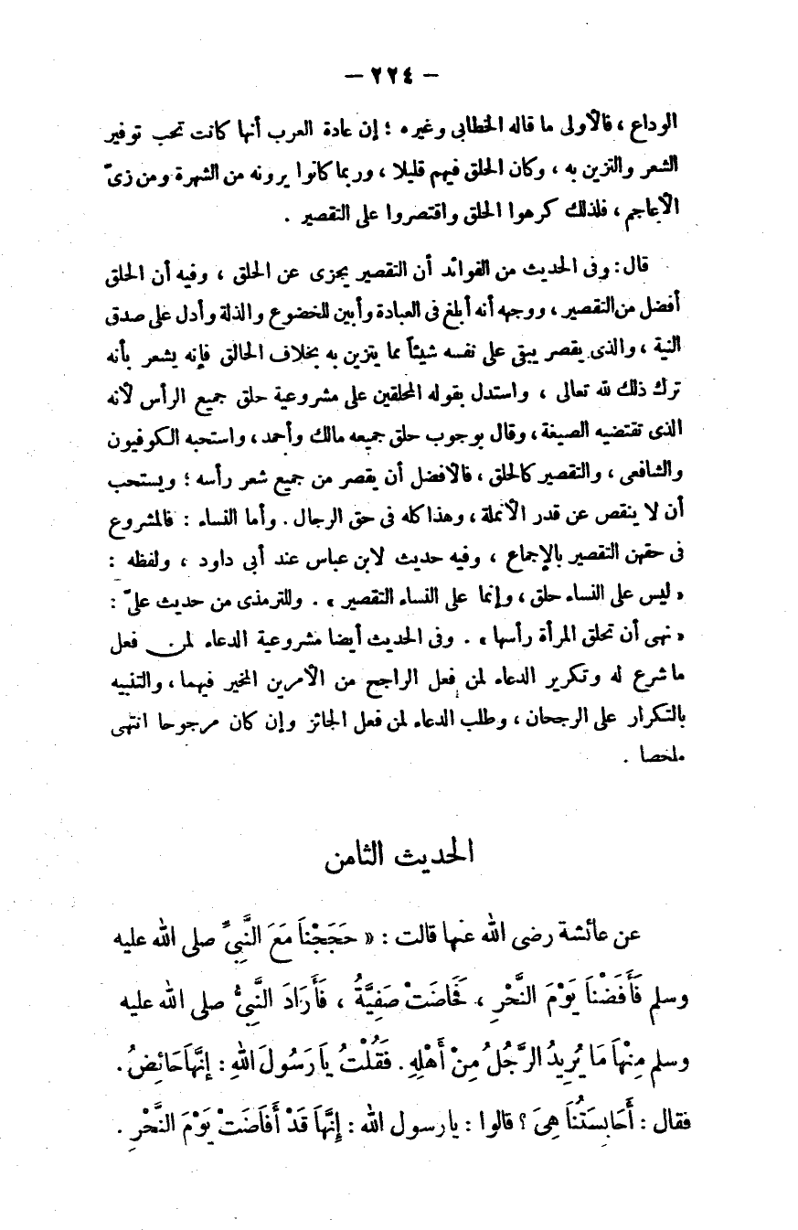 عن عائشة - رضي الله عنها - قالت: "حججنا مع النبي - صلى الله عليه وسلم - فأفضنا يوم النحر، فحاضت صفية، فأراد النبي - صلى الله عليه وسلم - منها ما يريد الرجل من أهله، فقلت: يا رسول الله، إنها حائض، فقال: ((أحابِسَتَنا هي؟)) ، قالوا: يا رسول الله، إنها قد أفاضت يوم النحر،