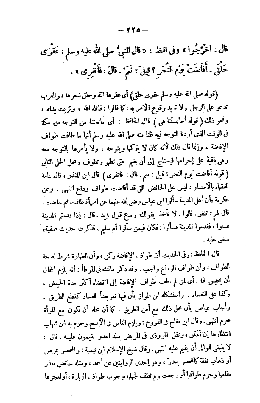 قال: ((اخرجوا)) ، وفي لفظ: قال النبي - صلى الله عليه وسلم -: ((عَقْرَى حَلْقَى، أفاضت يوم النحر؟)) ، قيل: نعم، قال: ((فانفري)) .