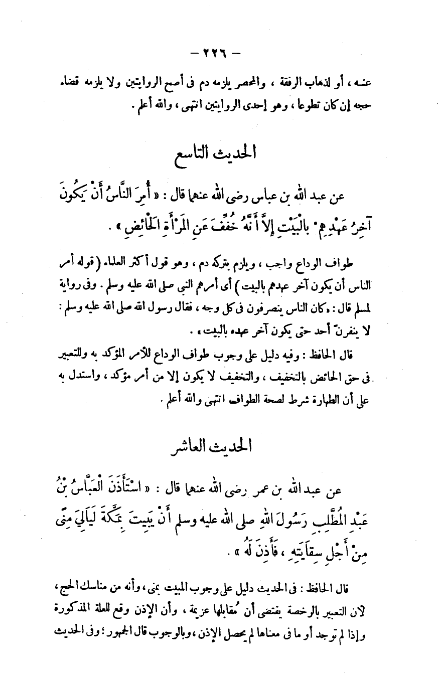 قال الحافظ: وفيه دليل على وجوب طواف الوداع للأمر المؤكَّد به وللتعبير في حق الحائض بالتخفيف، والتخفيف لا يكون إلا من أمر مؤكَّد، واستدلَّ به على أن الطهارة شرط لصحة الطواف، انتهى، والله أعلم.