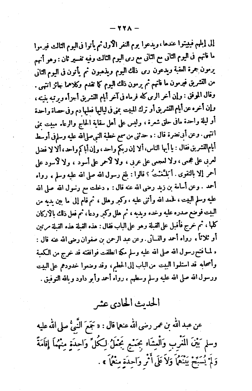 عن عبد الله بن عمر - رضي الله عنهما - قال: "جمع النبي - صلى الله عليه وسلم - بين المغرب والعشاء بجمعٍ يجعل لكلِّ واحدة منهما إقامة ولم يسبِّح بينهما، ولا على أثر واحدة منهما".