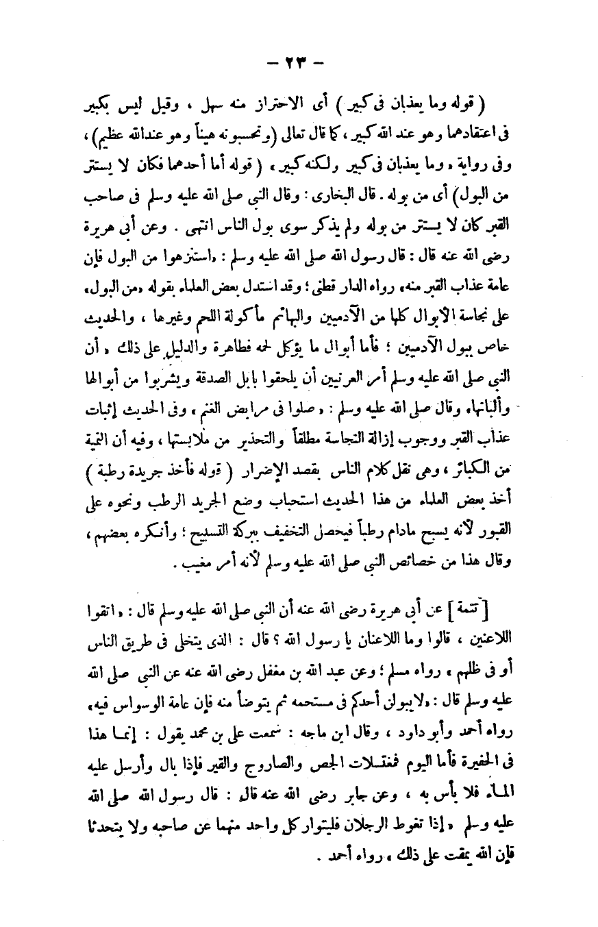 وعن أبي هريرة - رضي الله عنه - قال: قال رسول الله - صلى الله عليه وسلم -: ((استنزهوا من البول؛ فإن عامة عذاب القبر منه)) ؛ رواه الدارقطني، وقد استدلَّ بعض العلماء بقوله: ((من البول)) على نجاسة الأبوال كلها من الآدميين والبهائم مأكولة اللحم وغيرها، والحديث خاصٌّ ببول الآدميين؛ فأمَّا أبوال ما يُؤكَل لحمه فطاهرة؛ والدليل على ذلك: أن النبي - صلى الله عليه وسلم - أمر العرنيين أن يلحقوا بإبل الصدقة ويشربوا من أبوالها وألبانها، وقال - صلى الله عليه وسلم -: ((صلُّوا في مرابض الغنم)) .