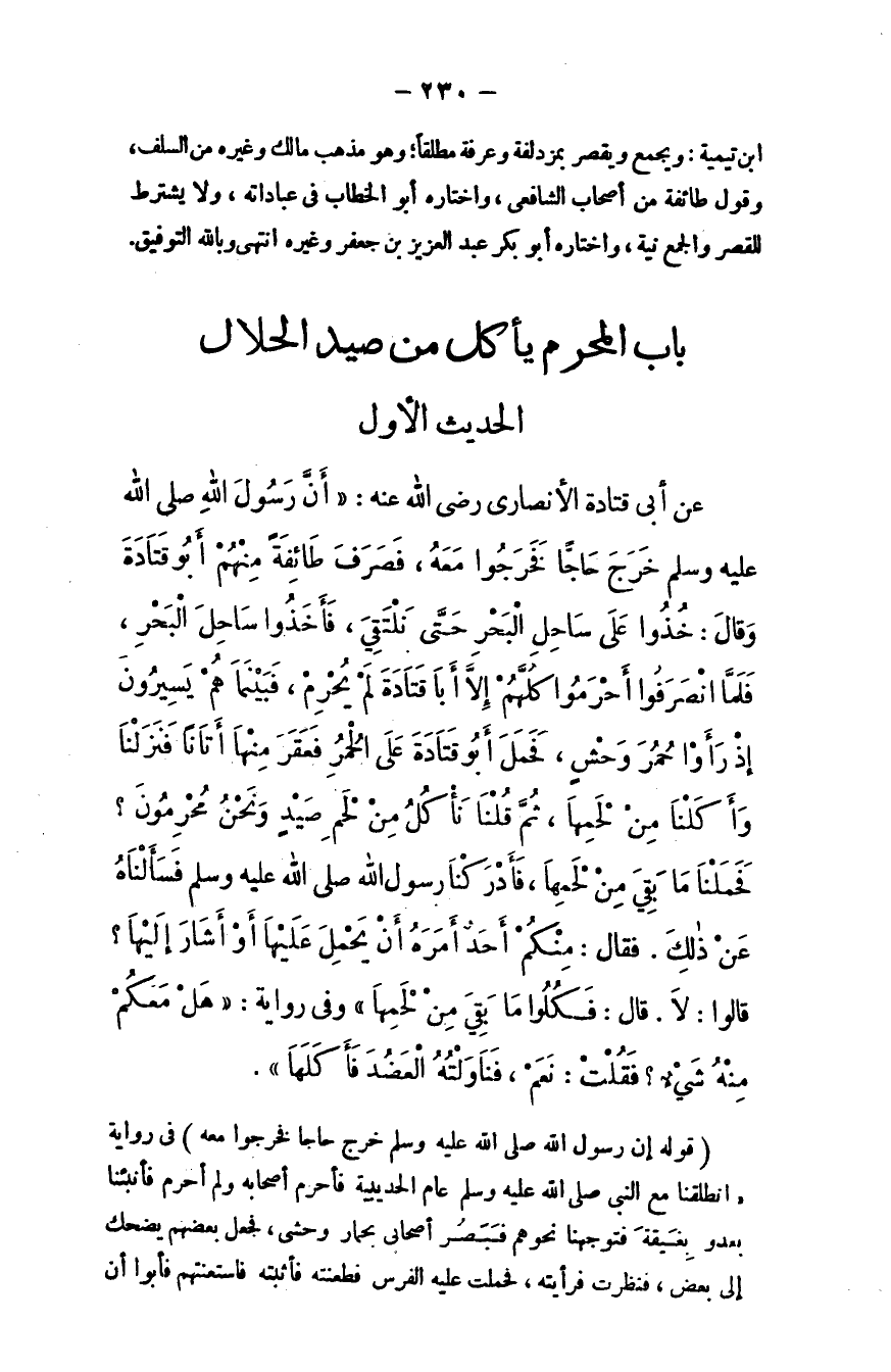 عن أبي قتادة الأنصاري - رضي الله عنه -: "أن رسول الله - صلى الله عليه وسلم - خرج حاجًّا فخرجوا معه، فصرف طائفة منهم أبو قتادة وقال: خذوا على ساحل البحر حتى نلتقي، فأخذوا ساحل البحر، فلمَّا انصرفوا أحرموا كلهم إلا أبا قتادة لم يحرم، فبينما هم يسيرون إذ رأوا حمر وحش، فحمل أبو قتادة على الحمر فعقر منها أتانًا فنزلنا وأكلنا من لحمها، ثم قلنا: نأكل من لحم صيد ونحن محرمون؟ فحملنا ما بقي من لحمها، فأدركنا رسول الله - صلى الله عليه وسلم - فسألناه عن ذلك، فقال: ((أمنكم أحدٌ أمَرَه أن يحمِل عليها أو أشار إليها؟)) ، قالوا: لا، قال: ((فكلوا ما بقي من لحمها)) ، وفي رواية: ((هل معكم منه شيء؟)) ، فقلت: نعم، فناولته العضد فأكلها.