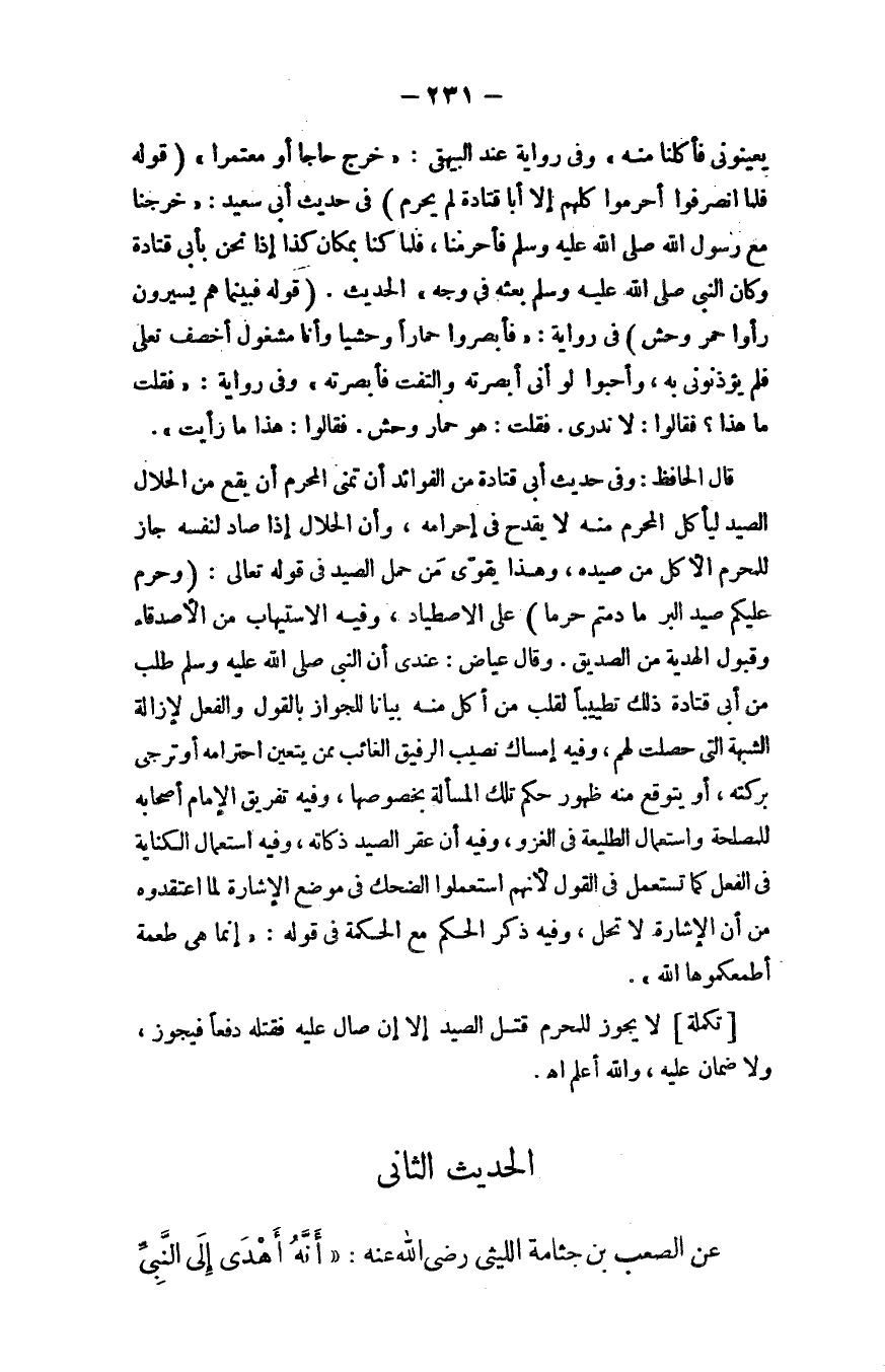 قال الحافظ: وفي حديث أبي قتادة من الفوائد أن تمني المحرم أن يقع من الحلال الصيد ليأكل المحرم منه لا يقدح في إحرامه، وأن الحلال إذا صاد لنفسه جاز للمحرم الأكل من صيده، وهذا يقوي من حمل الصيد في قوله - تعالى -: {وَحُرِّمَ عَلَيْكُمْ صَيْدُ الْبَرِّ مَا دُمْتُمْ حُرُمًا} [المائدة: 96] ، على الاصطياد، وفيه الاستيهاب من الأصدقاء وقبول الهدية من الصديق.