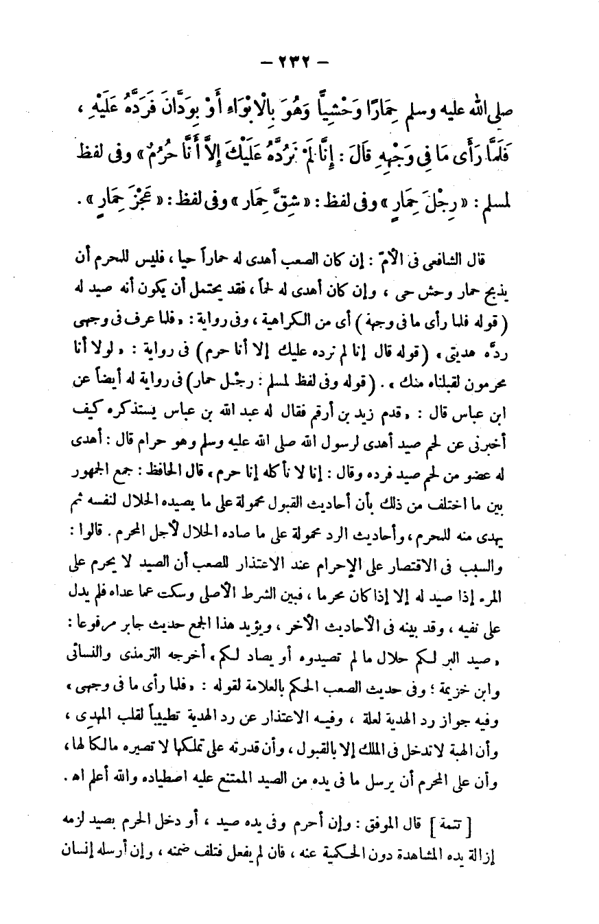 - صلى الله عليه وسلم - حمارًا وحشيًّا وهو بالأبواء أو بوَدَّانَ فردَّه عليه، فلمَّا رأى ما في وجهه قال: ((إنا لم نردَّه عليك إلا أنا حرم)) ، وفي لفظ لمسلم: "رجل حمار"، وفي لفظ: "شق حمار"، وفي لفظ: "عجز حمار".