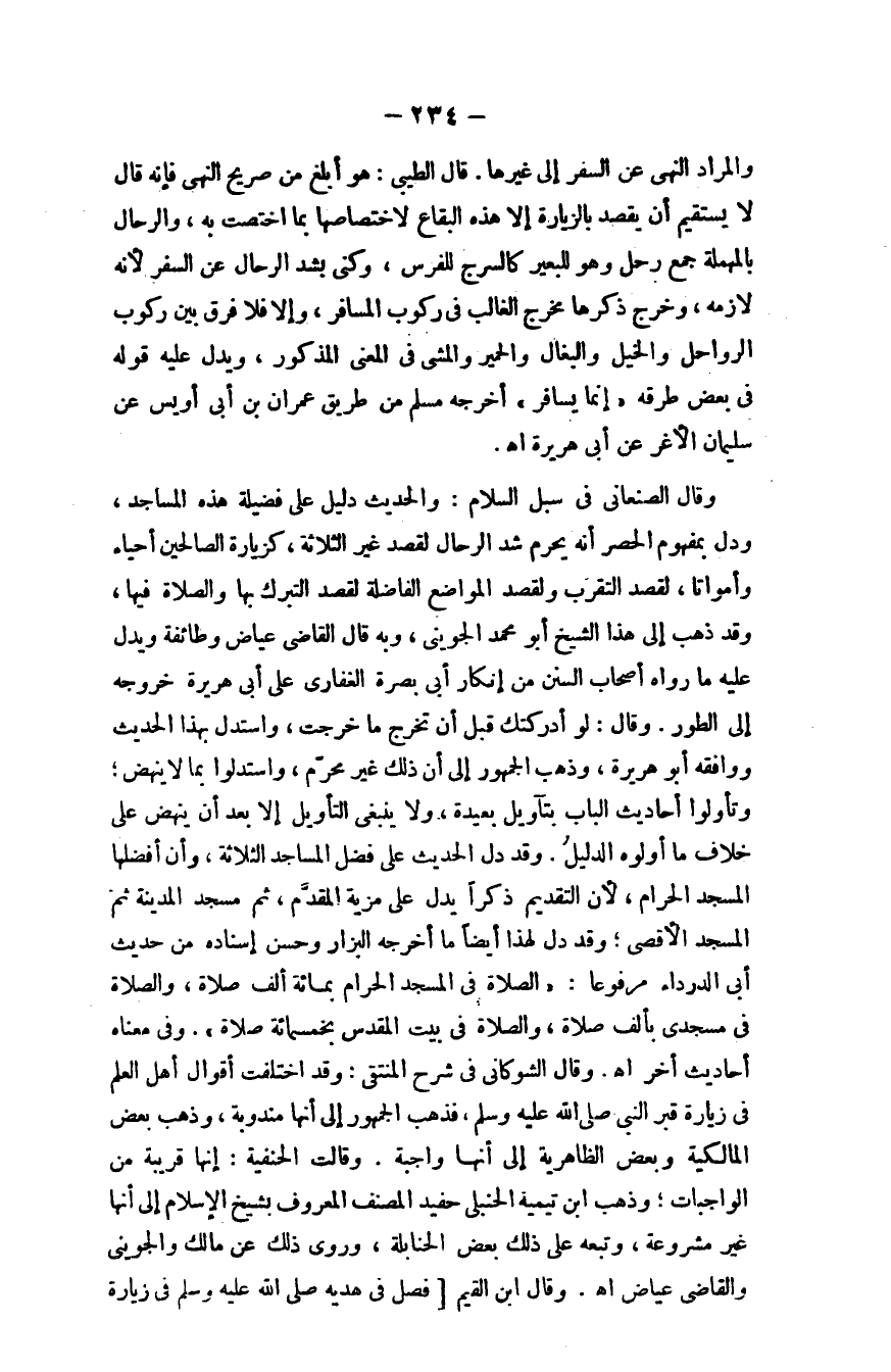 وقال الصنعاني في "سبل السلام": والحديث دليلٌ على فضيلة هذه المساجد، ودلَّ بمفهوم الحصر أنه يحرم شد الرحال لقصد غير الثلاثة، كزيارة الصالحين أحياءً وأمواتًا لقصد التقرُّب ولقصد المواضع الفاضلة لقصد التبرُّك بها والصلاة فيها، وقد ذهب إلى هذا الشيخ أبو محمد الجويني، وبه قال القاضي عياض وطائفة، ويدلُّ عليه ما رواه أصحاب السنن من إنكار أبي بصرة الغفاري على أبي هريرة خروجه إلى الطور، وقال: لو أدركتك قبل أن تخرج ما خرجت، واستدلَّ بهذا الحديث ووافَقَه أبو هريرة.