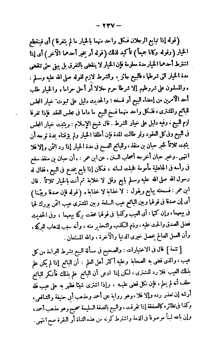 قال شيخ الإسلام: ويثبت خيار المجلس في البيع وفي كل العقود ولو طالت المدَّة، فإن أطلقا الخيار ولم يؤقتا بمدَّة توجَّه أن يثبت ثلاثًا لخبر حبان بن منقذ: وللبائع الفسخ في مدَّة الخيار إذا ردَّ الثمن وإلا فلا، انتهى.