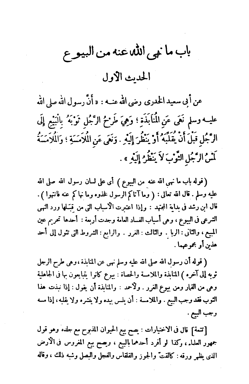 عن أبي سعيد الخدري - رضي الله عنه -: أن رسول الله - صلى الله عليه وسلم - نهى عن المنابذة؛ وهي طرح الرجل ثوبه بالبيع إلى الرجل قبل أن يقلبه أو ينظر إليه، ونهى عن الملامسة؛ والملامسة لمس الرجل الثوب لا ينظر إليه.
