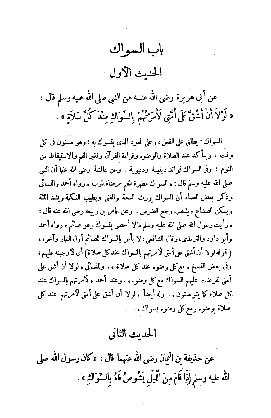 عن أبي هريرة - رضي الله عنه - عن النبي - صلى الله عليه وسلم - قال: ((لولا أن أشقَّ على أمتي لأمرتهم بالسواك عند كل صلاة)) .