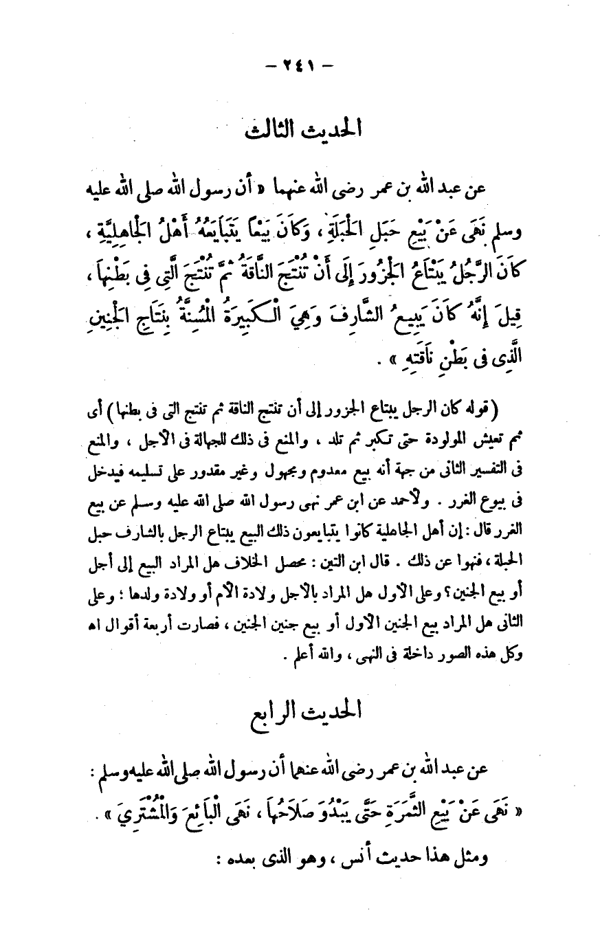 عن عبد الله بن عمر - رضي الله عنهما -: أن رسول الله - صلى الله عليه وسلم - نهى عن بيع حبل الحبلة، وكان بيعًا يتبايعه أهل الجاهلية، كان الرجل يبتاع الجزور إلى أن تنتج الناقة ثم تنتج التي في بطنها، قيل إنه كان يبيع الشارف وهي الكبيرة المسنة بنتاج الجنين الذي في بطن ناقته.